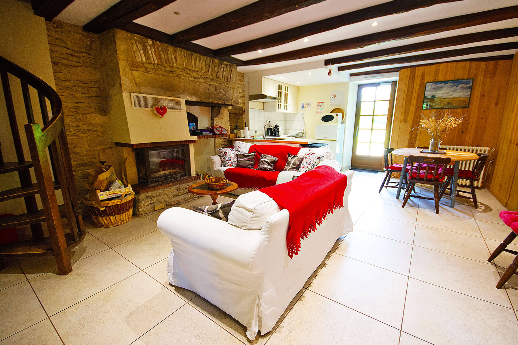 Au rez-de chaussée : une grande salle à manger avec cuisinette, un salon avec cheminée